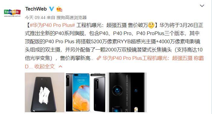 在这样的大环境之下作为国产手机领军人物的华为,会不会也把当家旗舰的价格继续上涨呢?解开这个谜底需求比及华为P40系列正式发布之后才干确认。不过近来关于华为P40系列的音讯现已人标准上的曝光转移到的价格之上,由于它的标准我们能想到肯定是十分强。比华为Mate 30系列还要强,所以价格就成为我们重视的点地点。就在今日据@TechWeb报导,华为P40 Pro Plus,也便是前段时间所讲的华为P40 皇帝版真机曝光,媒体猜测它的价格或过万。
