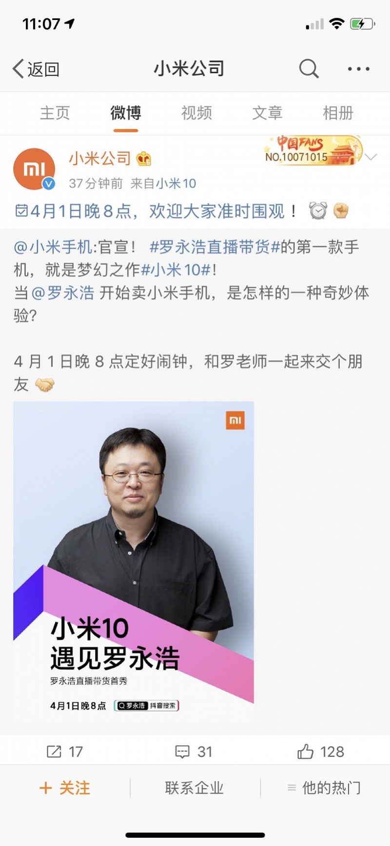 3月31日,间隔罗永浩的首场直播还有一天时刻。早早预订了罗永浩“首秀”的厂商现已刻不容缓剧透了——小米手机在当天早上10点官宣4月1日晚上8点罗永浩开“卖”小米10。