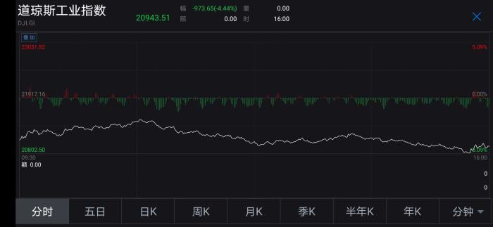 到收盘,道指收跌973.65点,跌幅4.44%,报20943.51点;纳指收跌339.50点,跌幅4.41%,报7360.58点;标普500收跌114.10点,跌幅4.41%报2470.50点,创3月20日以来最大单日跌幅。