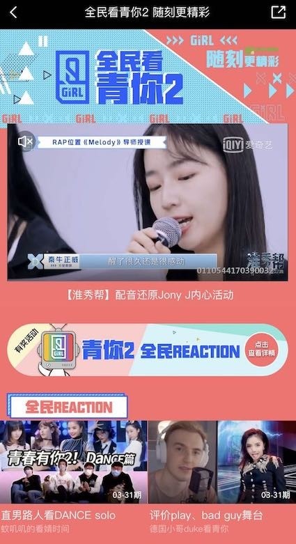 据悉,随刻将利用爱奇艺的IP资源优势,与影剧综等头部内容联动,形成在娱乐方面的差异化优势。比如,目前随刻已经与正在热播的综艺《青春有你2》打通,除了开放节目资源发起不同主题的短视频再创活动外,《青春有你2》全体训练生也入驻到随刻版app,用户都能够与选手之间进行互动。对于即将启动的《中国新说唱》2020云海选,随刻也将搭建专题开设专属参赛通道。